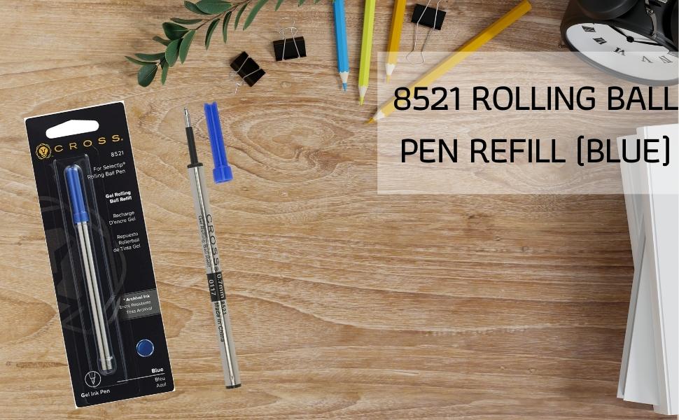 Cross 8521 Rolling Ball Pen Refill (Blue) A smooth alternative to the free-flowing ink of a fountain pen, with the convenience of a ballpoint. Gel ink refills are available in four classic colors, and are designed for use with all Cross Selectip pens. Enjoy this Cross gel rolling ball blue refill for a smooth writing experience and mess-free ink. Rely on this long-lasting blue gel pen refill that is designed for medium-point gel pens and enhances writing performance. This Cross rolling ball pen refill has the functionality of a ball point and is an alternative to the free-flow ink of fountain pens. Gel ink rolling ball refill, blue color Point size: 0.7mm, medium point Refill for Selectip pens Made in China