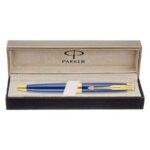Parker Aster Ball Pen With Matt Blue Finish Metal Barrel And Gold Plated Trim. A Contemporary & Unique Design Blended Highlighted With A Gold Plated Ring On The Barrel. Material: Matte Finish metal barrel and Gold plated Trim. Gold Plated Ring On The Barrel A contemporary and unique design blended highlighted with a gold plated ring on the barrel Engraved text will be in Gold colour Made in India